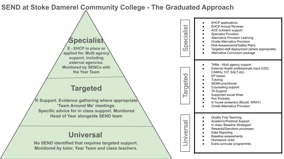 Below is a visual representation of how the Graduated Approach is addressed at Stoke Damerel Community College. Many students, including those with SEND, make good progress academically, socially and emotionally with our universal offer. However, we recognise that there are students who require a more targeted or specialist approach in order for their individual needs to be met.