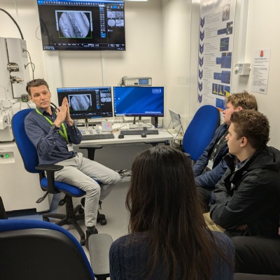 During the visit, students learned about both scanning and transmission electron microscopes, beginning with an informative talk from Glenn, an electron microscopist at the university. He explained the complex and highly detailed process involved in preparing samples for electron microscopy, which can take four to five days and involves multiple specialist techniques. Students were also introduced to freeze-plunging using liquid nitrogen, an advanced method used to preserve samples prior to imaging.