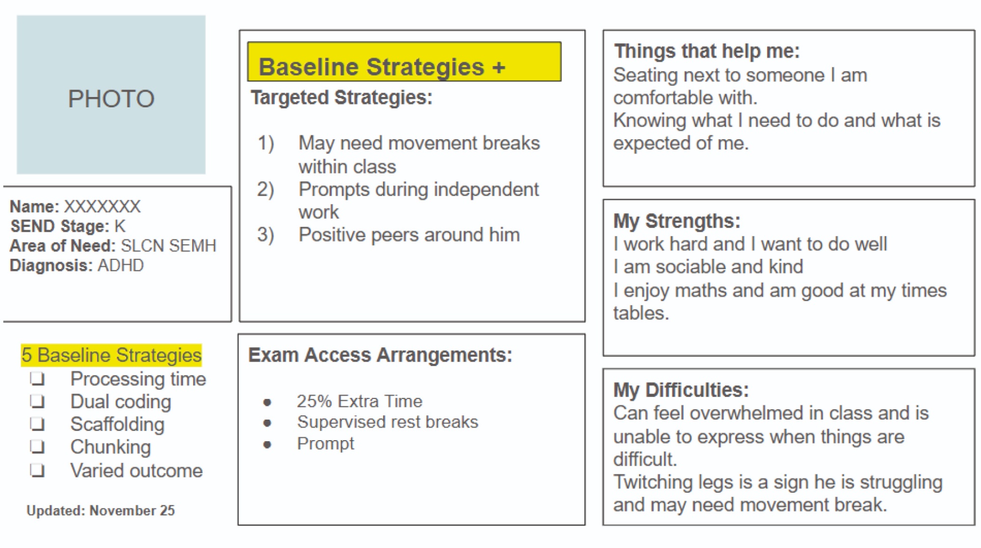A pen portrait is a regularly reviewed document that contains the needs, strengths and individual strategies for every student with an EHCP or on SEN Support. These are developed in partnership with pupils and their parents/carers. Where appropriate, they might also include strategies recommended by other professionals.